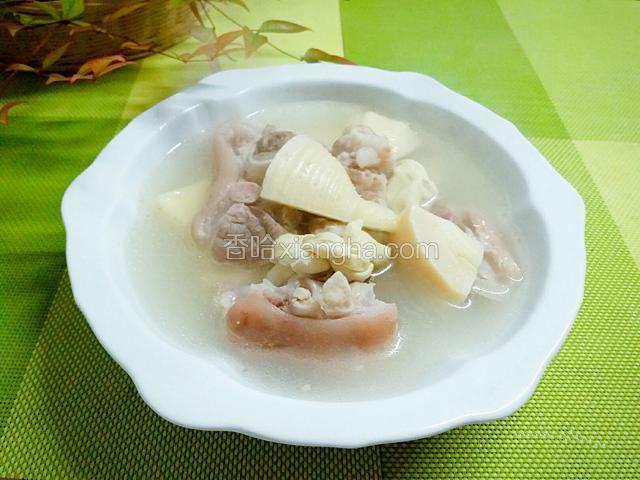 6.新鲜猪蹄与咸猪蹄同时入汤锅,加入食材3-4倍的清水,大火烧开转中火10分钟;