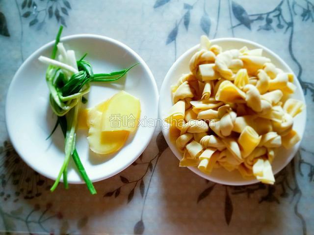 3.生姜洗净切片、小香葱已经打结、百叶结过水去除浮尘;