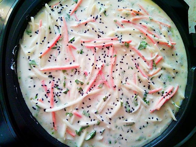 4.把土豆丝,红萝卜丝,芹菜叶倒入面糊里,加入盐,五香粉,十三香搅拌下,给面糊上撒上一层黑芝麻。