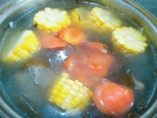 6.捞出葱结,加入玉米和胡萝卜,转中火烧开,再转小火继续熬煮20-30分钟;