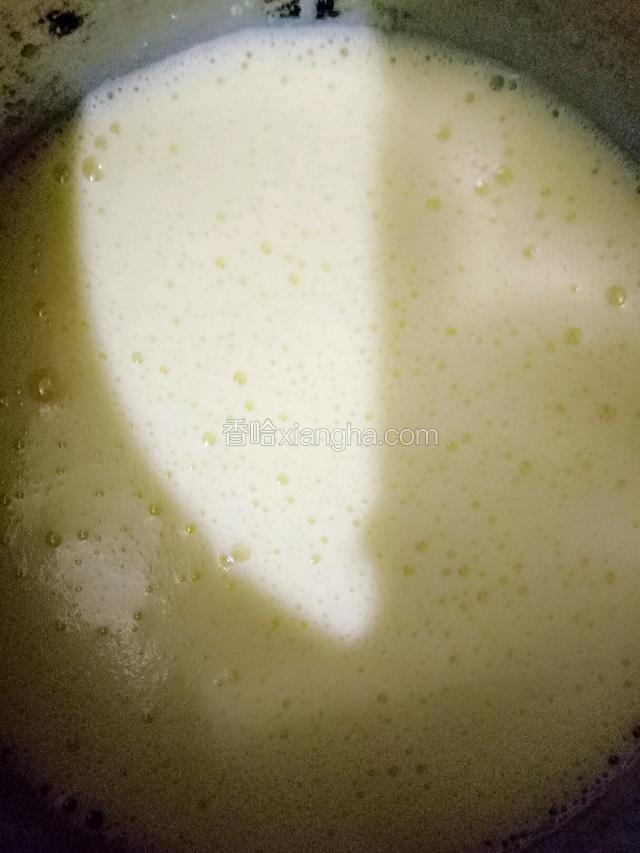 6.打蛋器低速打至蛋液逐渐体积增大,颜色发浅,转中速继续打至蛋糊膨胀粘稠,最后打蛋器改为低速搅打,把大泡打走,提起打蛋器蛋液的痕迹不会立刻消失即可