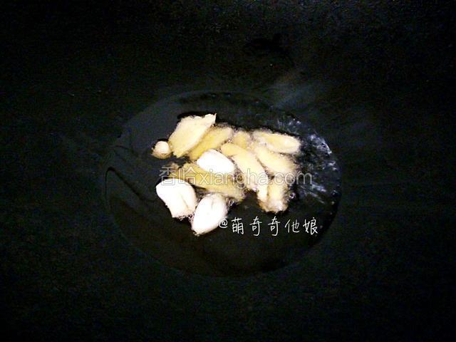 5.锅中倒入适量底油,并下姜蒜大火爆香。