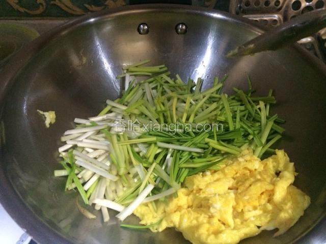 6.将鸡蛋铲到炒锅一边,锅内倒入蒜苗,蒜苗十分容易炒烂,