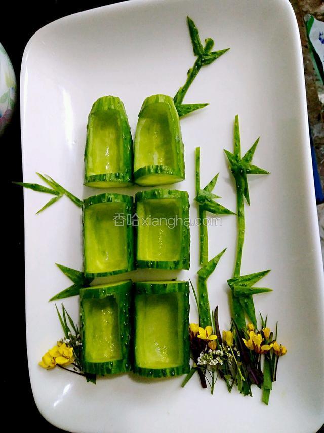 4.用小勺子把黄瓜瓤挖出来,摆盘备用。如图
