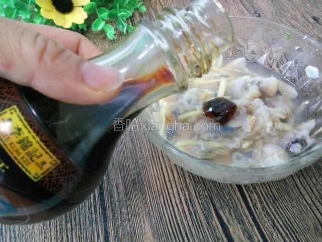 5.加上盐生姜丝、白酒用手抓匀。醉15分钟左右。