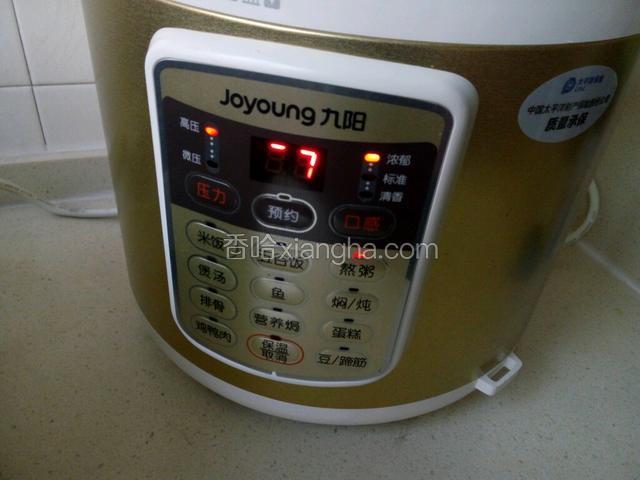 2.把黑米黑豆和泡米的水全加入电压力锅中。我又加了800克的温水。不易煮熟的食材用电压力锅煮最好,省时又软烂。