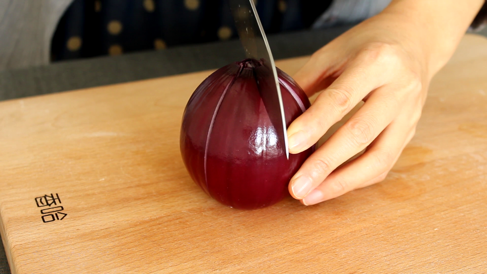 4.用刀竖着切下,不要切到底,底部留约三厘米