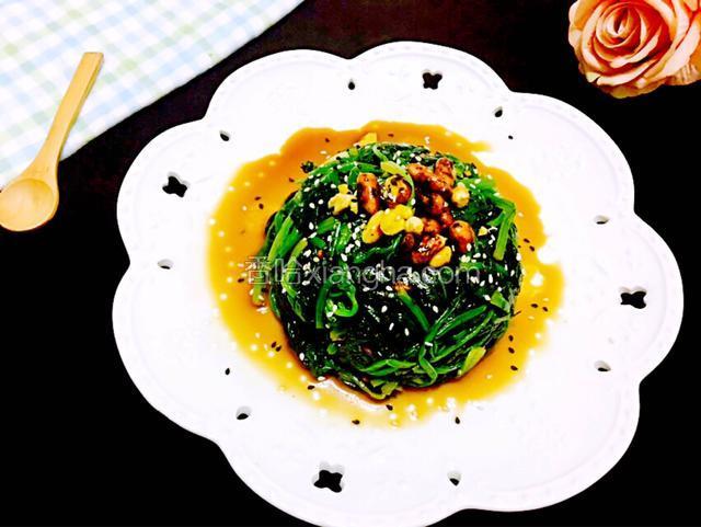 4.烫过的菠菜放入冷开水中浸泡30秒,降温。