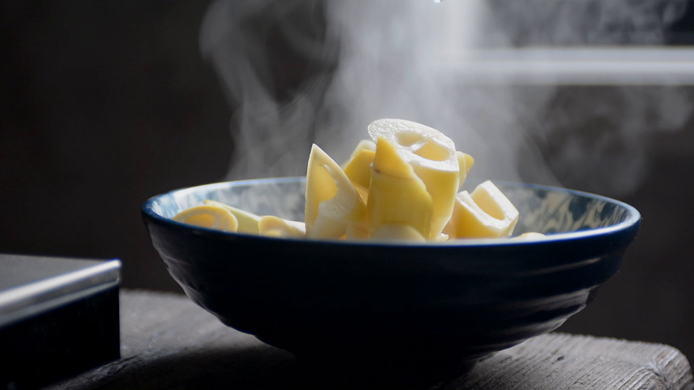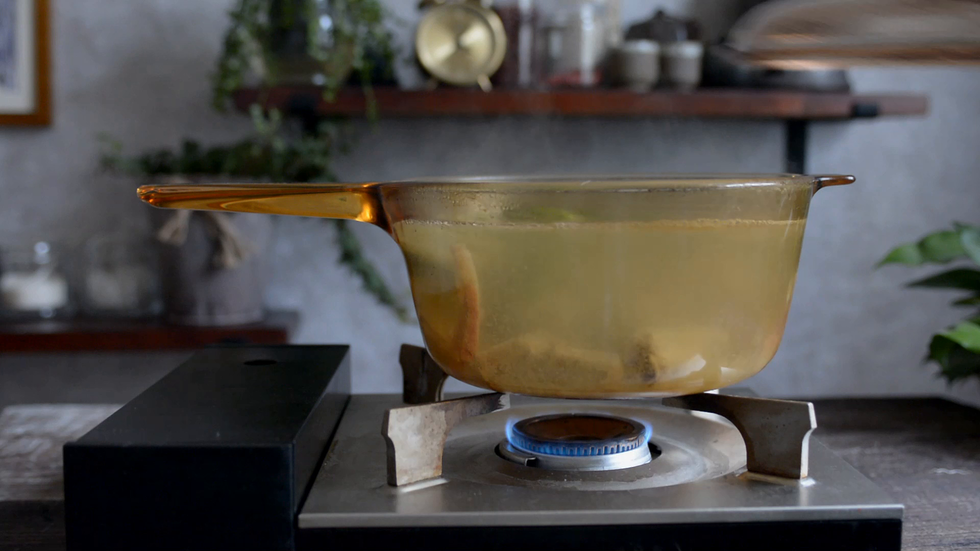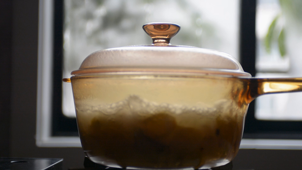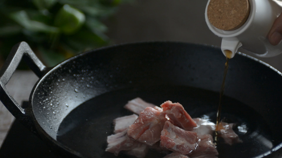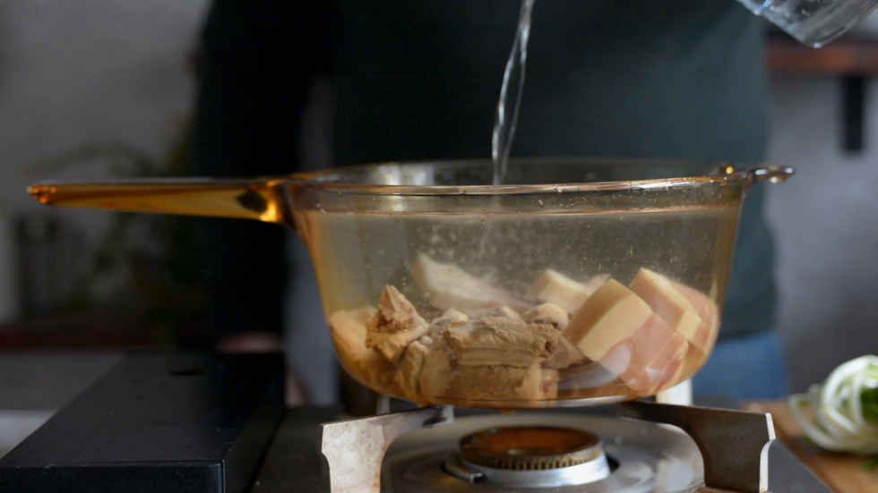 6.与泡过的咸肉一起放入炖锅,加适量的冷水和葱姜