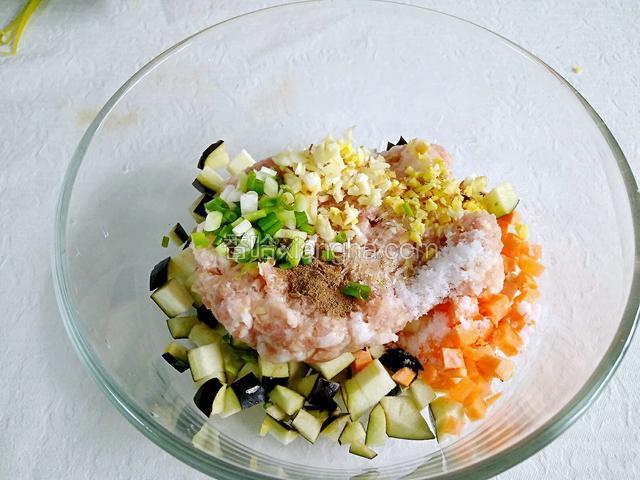 1.茄子洗净切碎,红萝卜削皮切碎,放入大碗