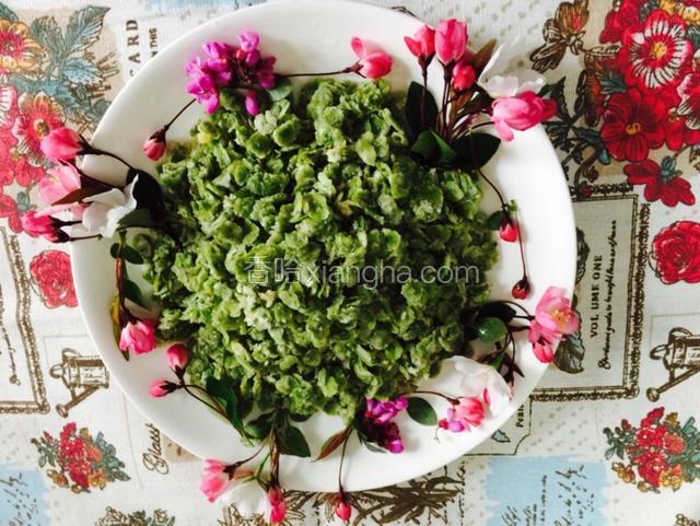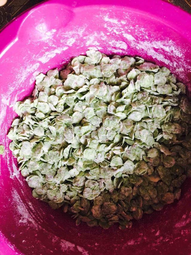 3.榆钱里放入少量油,少许盐,十三香,花椒粉,搅拌均匀,最后放入玉米面和面粉,不要一次性放进去,一边搅拌一边加入,感觉每个榆钱都裹住了面粉,而且不粘连,就好了
