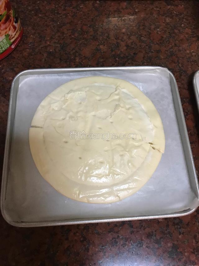3.披萨坯解冻,放在铺了油纸的烤盘上。