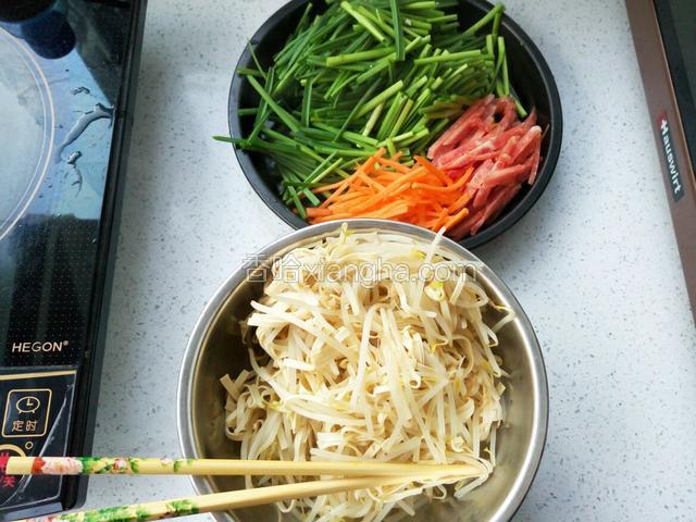 5.锅里烧热水 放入干豆腐丝和绿豆芽 去除腥味