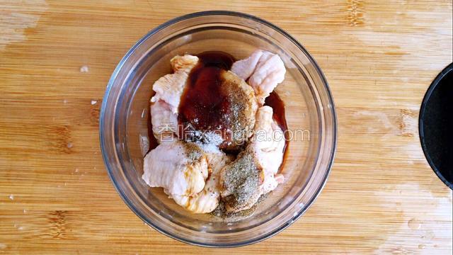 5.剔骨鸡翅放入干净碗里,调入盐、耗油、生抽、黑胡椒碎