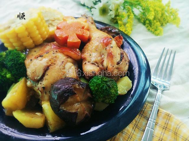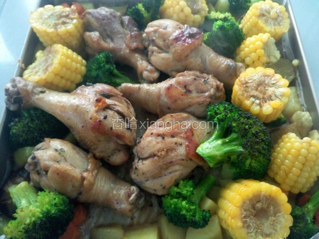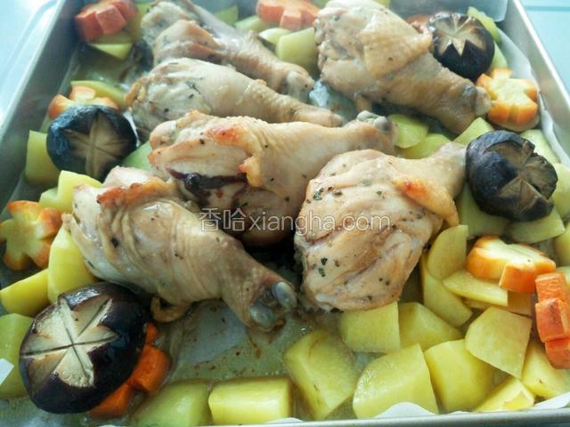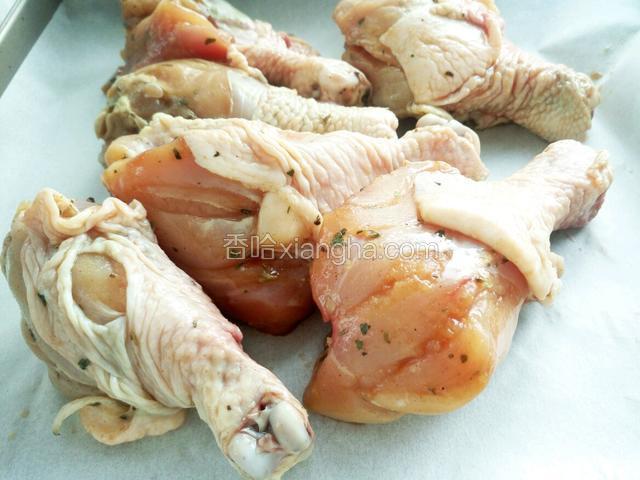 5.这是腌制好的鸡腿 控净腌料中的水分 放入烤盘中
