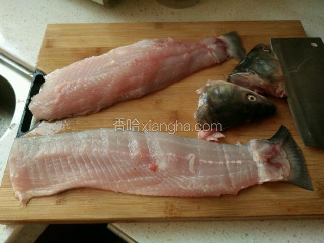 1.把鱼洗干净,剁掉鱼头,沿着鱼背大骨分别取下两边的鱼肉,再用刀把鱼肚的大刺去掉,得到两块完整的鱼肉。