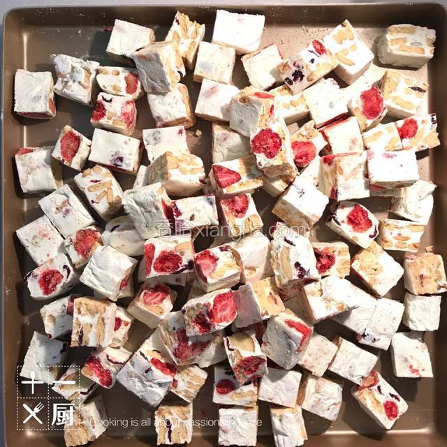 4.奶粉和草莓粉混合均匀过筛,草莓坚果放烤盘送进烤箱100度保温